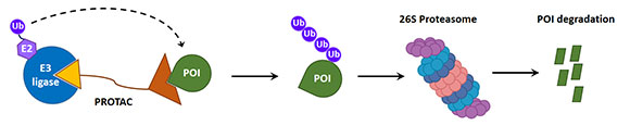 In this context, an innovation that could have a significant impact in “drugging the undruggable” is the recent development of a variety of heterobifunctional molecules that tether together a ligand that binds the protein of interest (POI) with another ligand that engages an E3 ubiquitin ligase, facilitating the ubiquitination and the subsequent degradation of the former by the 26S proteasome. These heterobifunctional molecules are called PROteolysis-TArgeting Chimeras or PROTACs15 (Figure 2).