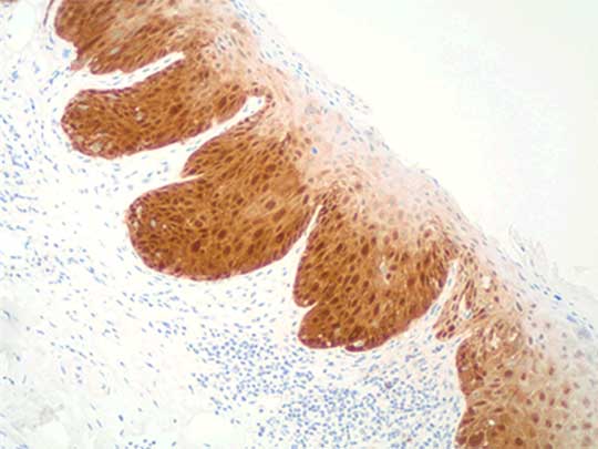 Figure 1. Anal tissue incubated with p16INK4a monoclonal antibody and then stained with POLYVIEW PLUS HRP-DAB Kit (ENZ-KIT160).