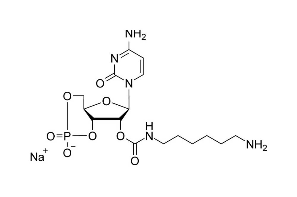 Analogue of cCMP (Cat. No. C 001), suitable as a ligand for affinity chromatography of cCMP binding proteins or for coupling of various labelling structures including fluorophores. This ligand is also available immobilized on agarose gel (2’-AHC-cCMP-Agarose; Cat. No. A 158).