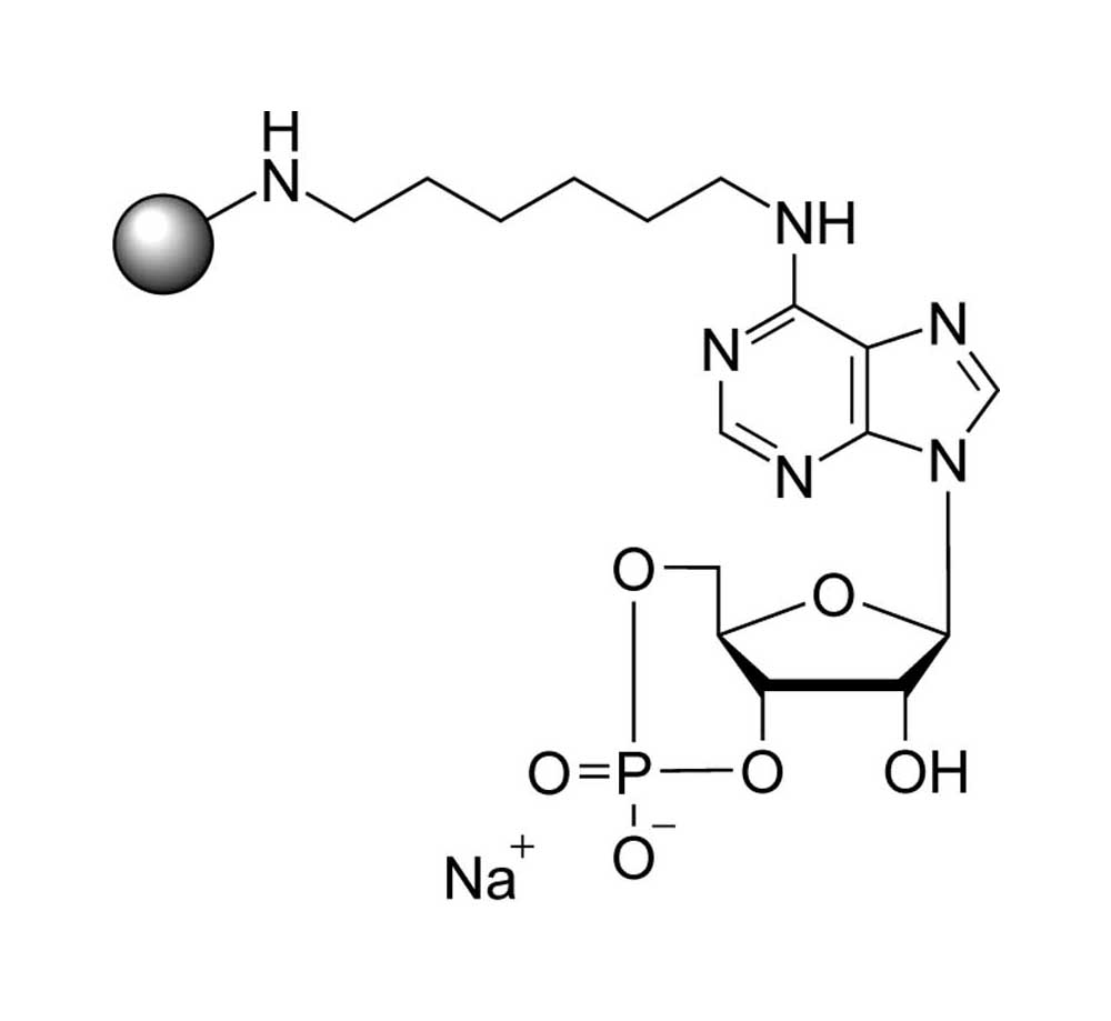 Cyclic AMP immobilized on agarose by an aminohexyl spacer attached to position 6 of the ligand. The gel can be used for affinity chromatography of various cyclic nucleotide-responsive proteins such as protein kinases, phosphodiesterases and others.