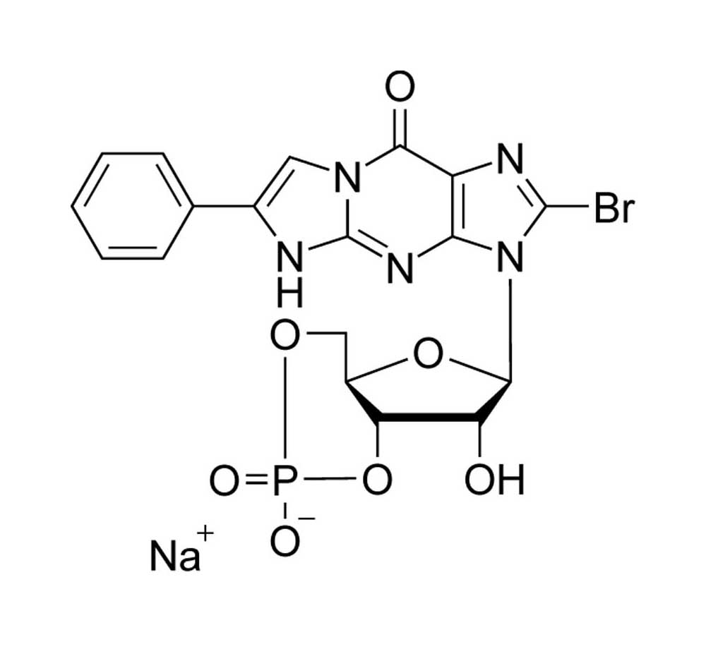 Potent membrane permeant activator of cGMP-dependent protein kinase type I α and I β. In contrast to common stimulators such as 8-Br-cGMP or 8-pCPT-cGMP which mainly activate kinase subtype I α, 8-Br-PET-cGMP is one of the best activators of isozyme I β and one of the best cyclic nucleotide muscle relaxants. BIOLOG also offers the corresponding PDE-stable structure Rp-8-Br-PET-cGMPS (Prod. No. BLG-P007) and Sp-8-Br-PET-cGMPS (Prod. No. BLG-P008).