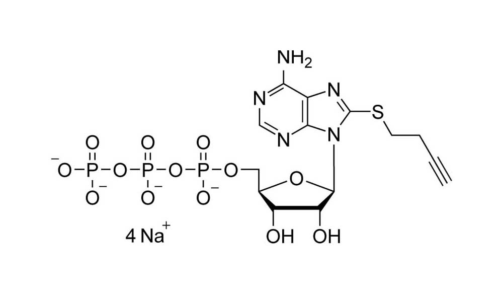 The alkyne-containing 8-Bu(3-yne)T-ATP is an analogue of ATP and a suitable molecular tool for the copper-catalysed Huisgen azide-alkyne [3+2] cycloaddition (CuAAC), which has attracted particular interest for the introduction of reporter groups and for the labelling of various biomolecules like ATP-binding proteins by the so-called click-chemistry technique.