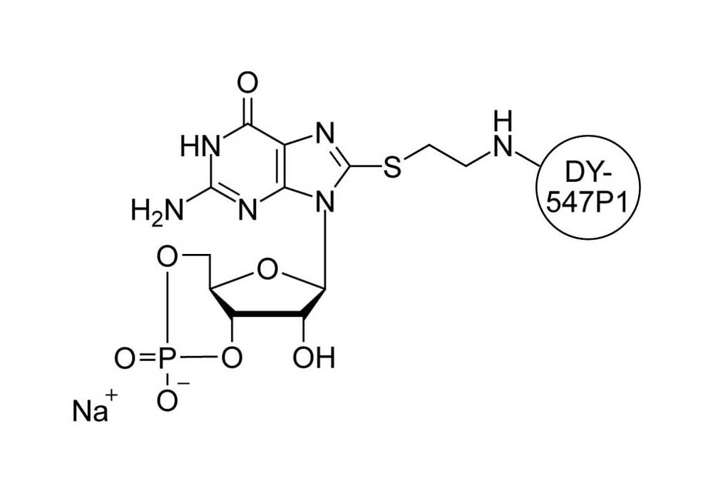 8-[DY-547P1]-AET-cGMP is a fluorescent cGMP analogue (λexc 559 nm, λem 575 nm (EtOH); λexc 551 nm, λexc 565 nm (PBS)) e.g. for research focussed on kinetic studies of CNG ion channels and other cGMP-responsive binding proteins.