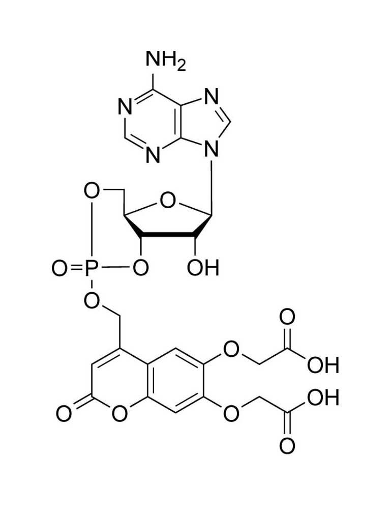 BCMCM-caged cAMP is an only weakly fluorescent, caged precursor of the second messenger cyclic AMP, which upon irradiation, releases both cAMP and a fluorescent coumarin analogue.