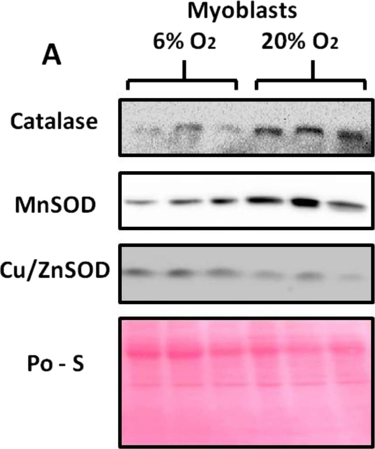 Representative western blots of catalase, MnSOD and Cu/ZnSOD in (A) myoblasts and (B) myotubes grown in 20% or 6% O2 environments. Ponceau S staining (Po-S) shows equal amount of protein loading.