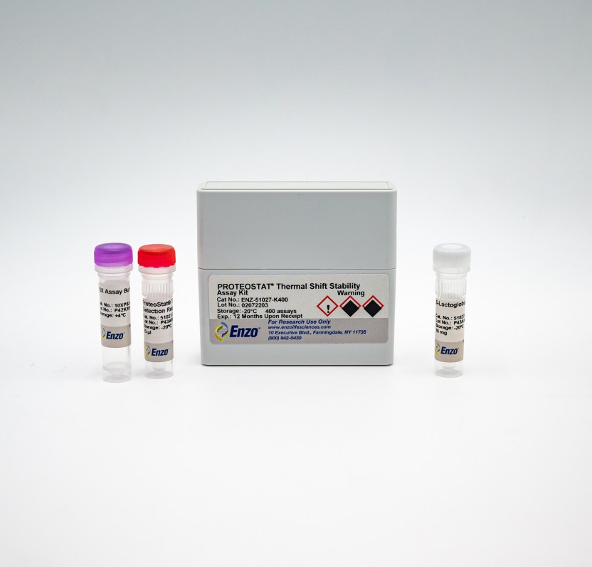 The PROTEOSTAT® Thermal shift stability assay kit includes a fluorescent dye which detects protein aggregation, so it can be used to monitor protein stability under systematic thermal stress conditions. From the thermal shift assay, a temperature at which the bulk of the protein becomes aggregated can readily be identified. The aggregation temperature is an indicator of protein stability and can be used to optimize conditions that minimize protein aggregation as well as to identify ligands that bind and confer structural stability to a protein of interest. Use the related PROTEOSTAT® Protein Refolding and Aggregation Sensing Kit (Prod. No. ENZ-51040) to identify optimal protein refolding conditions. Conditions that increase the aggregation temperature, increase the stability of the protein.