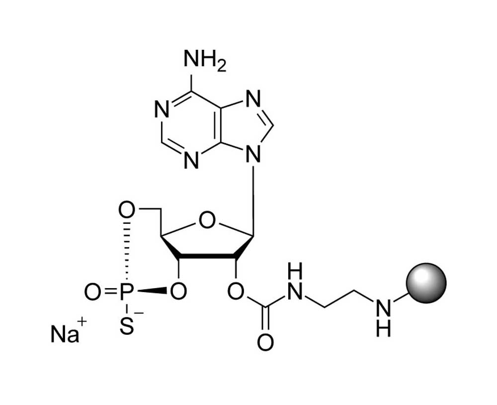 The protein kinase A inhibitor Rp-cAMPS (Prod. No. BLG-A002) immobilized on agarose by an aminoethylcarbamoyl spacer attached to the ribose 2′-position of the ligand. Free Rp-cAMPS is not metabolized by mammalian phosphodiesterases and thus represents an extraordinary stable ligand. In addition, its reduced binding affinity towards protein kinase A compared to cAMP results in milder desorption conditions during affinity chromatography. The gel can be used for affinity chromatography of various cyclic nucleotide-responsive proteins, especially those which tolerate modification of the 2′-ribose hydroxyl group such as some phosphodiesterases. This type of gel is offered with a longer spacer (Rp-2′-AHC-cAMPS-Agarose, Prod.. No. BLG-A049) as well