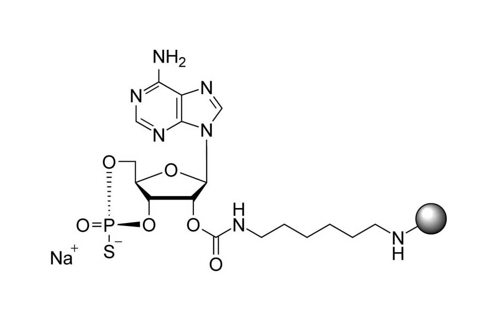 The protein kinase A inhibitor Rp-cAMPS immobilized on agarose by an aminohexylcarbamoyl spacer attached to the ribose 2′ position of the ligand. The gel can be used for affinity chromatography of various cyclic nucleotide-responsive proteins, especially those which tolerate modification of the 2′ ribose hydroxyl group such as some phosphodiesterases. This type of gel is also available with immobilized PDE-resistant Sp-cAMPS (Sp-2′-AHC-cAMPS-Agarose (Prod. No. BLG-A050)) or with normal cAMP (2′-AHC-cAMP-Agarose (Prod. No.: BLG-A058)).