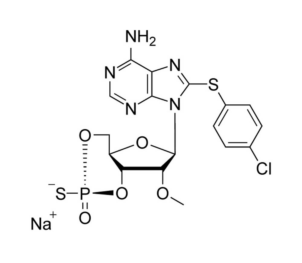 Analog of the natural signal molecule cyclic AMP in which the hydrogen in position 8 of the heterocyclic nucleobase is replaced by the lipophilic 4-chlorophenylthio moiety, and the ribose 2’-hydroxyl group has been methylated. In addition, the axial one of the two exocyclic oxygen atoms in the cyclic phosphate moiety is modified by sulfur. The suffix “p” indicates that the R/S nomenclature refers to phosphorus atom.